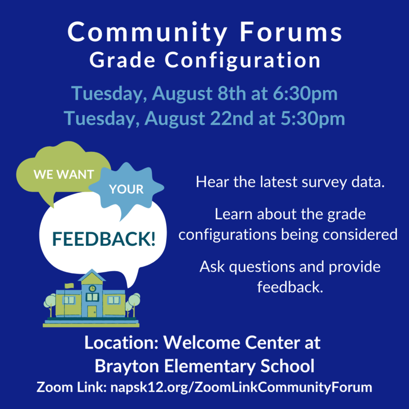 Forums are open to anyone interested in learning more about the options being considered for the district and will specifically highlight the recent survey results, how this decision will impact district assigned schools, and allow for participants to ask questions and provide feedback about the potential grade configurations.
