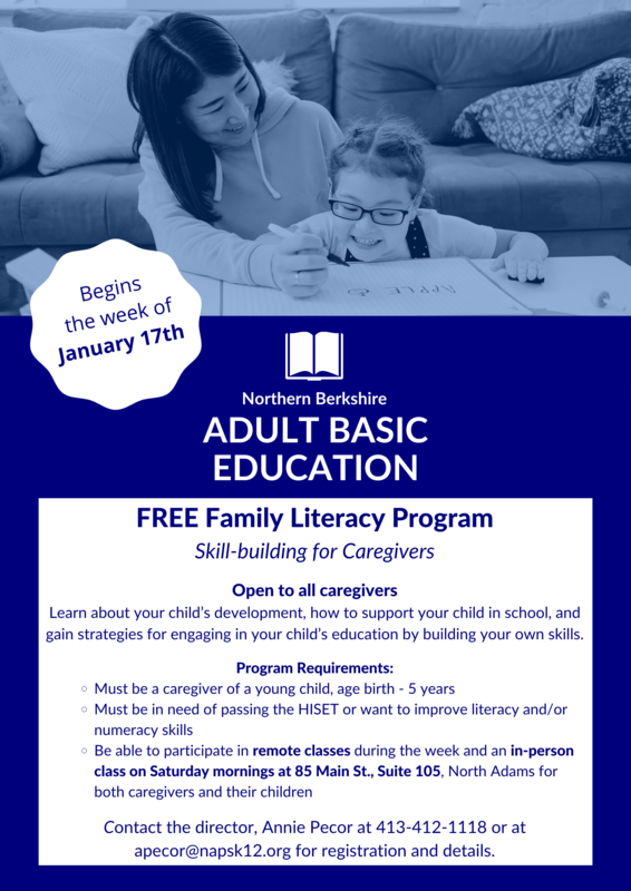 Both programs will begin the week of January 17th. In-person classes will take place at 85 Main Street, Suite 105 in North Adams. For more information, including registration information, please contact Annie Pecor at apecor@napsk12.org or at 413-412-1118.