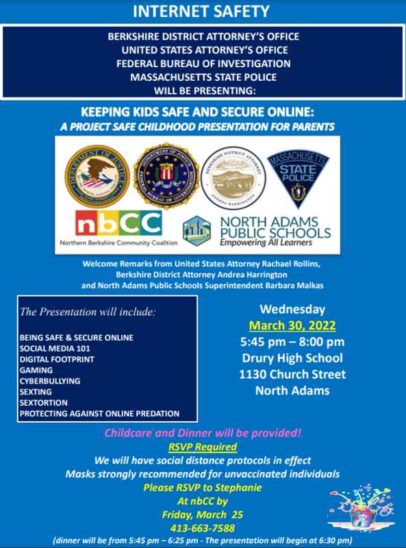 The Berkshire District Attorney’s office, in collaboration with the United States Attorney’s Office, the Federal Bureau of Investigation, Massachusetts State Police, North Adams Public Schools and Northern Berkshire Community Coalition invites you to a Project Safe Childhood Keeping Kids Safe and Secure Online evening internet safety presentation for parents. Details are below. Please feel free to share the attached flyer as well.