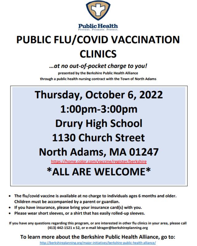 COVID/Flu Vaccine Clinics have been jointly organized by the Berkshire Public Health Alliance and the North Adams School District. The clinics will take place on Thursday, October 6th from 12:30-2:00 pm at Drury High School and on Wednesday, October 12th from 3:00-6:00 pm at Colegrove Park Elementary School. All are welcome. Registration can be completed at https://home.color.com/vaccine/register/berkshire