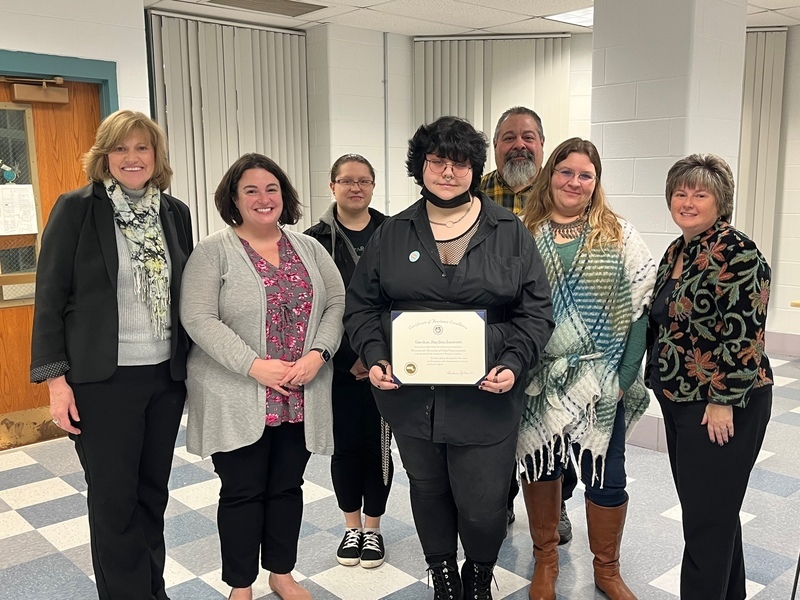 Evan-Quin May-Sims Goodermote, recipient of the Superintendent's Certificate of Academic Excellence, poses with family members, Superintendent Barbara Malkas, Drury Principal Stephanie Kopala and Mayor Jennifer Macksey.