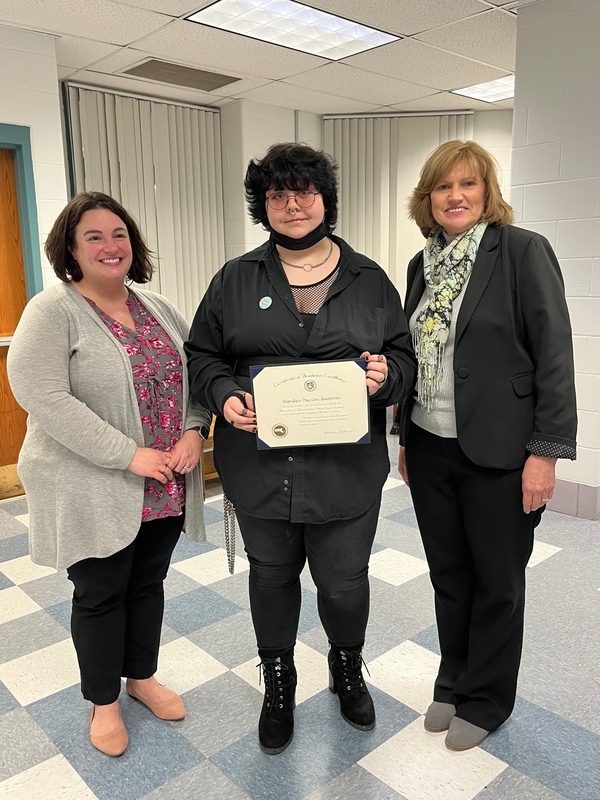 Evan-Quin May-Sims Goodermote poses with Superintendent Barbara Malkas, and Drury Principal Stephanie Kopala